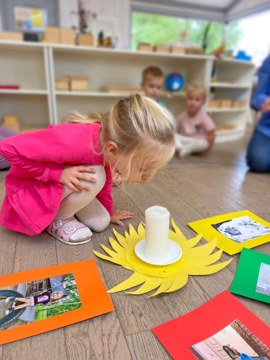 - Скоро восемь, а пока три." В Монтессори-классе в этот день дети собираются и усаживаются в круг в честь именинника. В центре круга ставят свечу, символизирующую Солнце. Ребенок, у которого день рождения, обходит с глобусом в руках импровизированное Солнце столько раз, сколько лет провел на Земле.