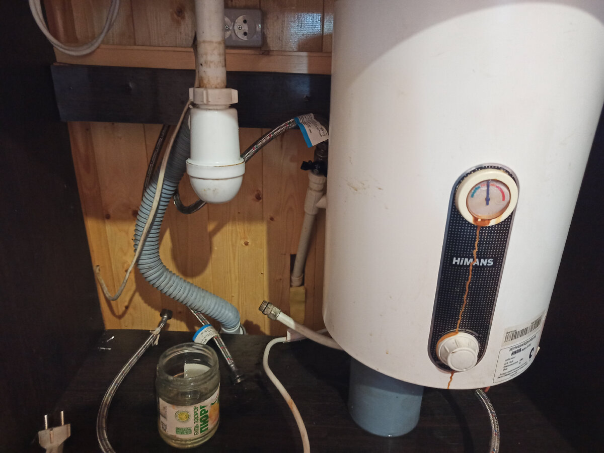 Итак, потек у нас на даче водонагреватель на кухне. Был он старый уже, проточный, 10-ти литровый. Да и эксплуатация его была видимо не самой правильной. Предыдущими владельцами. В общем было принято его заменить. Купили маленький, проточный, встроенный в смеситель. Штука по отзывам неплохая. Основной головной болью стал демонтаж старого нагревателя. Естественно, сначала были перекрыты все краны. Потом откручены все шланги. И тут я потерпел фиаско, забыв, что в нагревателе вообще-то осталось немало воды. Причем горячей. Получился небольшой потоп, который правда был достаточно быстро устранен, а остатки воды перенаправлены в таз. Больше всего возни вышло со снятием нагревателя, который был намертво прикручен болтами внизу под раковиной. По началу хотел обойтись без перемещения мебели, но не получилось. А вот после того, как все старое было успешно снято, дальше пошло как по маслу. Правда вот провод не удалось пропустить в то же отверстие, что и новый смеситель. Я считаю, что это к