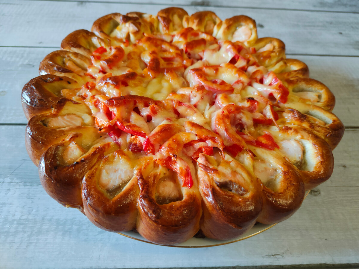 Не самый бюджетный пирог, и я не так часто его пеку, обычно на свой день рождения. Но уж очень он необычный, красивый и вкусный получается. От души рекомендую: Для теста - - молоко тёплое 100 мл - дрожжи прессованные (живые) 12 г или сухие 4 г - яйцо 1 шт. - мягкое сливочное масло 70 г - сахар 2 ст.ложки без горки (35 г) - соль 1 ч.ложка без горки (5 г) - мука примерно 280 г Для начинки - - сырое филе красной рыбы 500 г - перец красный сладкий 1 шт. - помидор 1 шт. небольшой или горсть черри - сыр моцарелла 120 г - соль, перец молотый - по 1/2 ч.ложки (желательно белый, у меня смесь 5 перцев) + для смазывания пирога 1 желток и 1 ч.ложка молока Тесто холодной ферментации замешиваем заранее. В тёплом молоке растворяем соль и сахар: Разводим дрожжи: Добавляем яйцо и примерно половину муки из общего объёма. Перемешиваем тесто лопаткой: Вмешиваем мягкое сливочное масло: Всыпаем оставшуюся муку и замешиваем тесто вручную. Тесто получается довольно плотное: Вымешиваем до гладкости, округляем