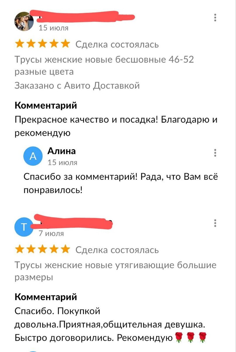Кто на канале первый раз, я с марта являюсь действующим поставщиком на WB. Это мой второй заход, про первый можно прочитать ЗДЕСЬ. Я решила не останавливаться только на Вайлдбериз, а так же развивать другие каналы продаж. Сначала думала в сторону OZON, но дальше формирования карточек руки не дошли, поэтому я решила продавать трусы на Авито. Тем более у меня бракованные трусы, которые на WB явно не продашь. Брак не критичный, не ровно пришитый шов сверху. Сначала я разметила на Авито объявление с бракованными трусами. Более 2-х недель объявление болталось незамеченным, а потом потихоньку пошли продажи. Тогда я решила разместить и обычные трусы по штучно. На Авито у меня уже есть несколько положительных отзывов о покупке трусов😍 Кстати чаще всего покупают через Авито доставку, даже если человек живёт в Санкт-Петербурге, как и я. Но есть и довольно странные покупатели. Часто мне писали мужчины с просьбой выслать им поношенные трусы. А недавно написала девушка, на которую я потратила пос