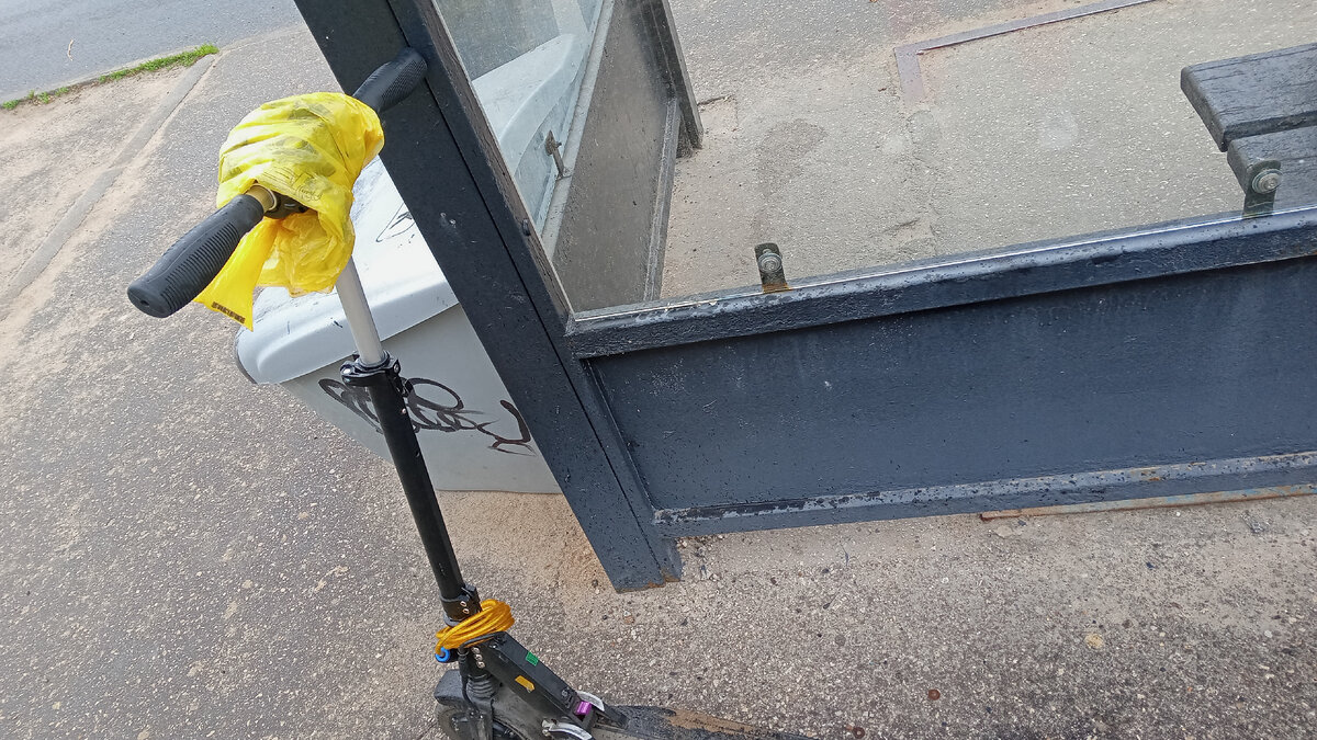 Была я в дальнем конце нашего города и начался дождь. Намотала Кугусику на мордаху пакет и он вывез меня на главную улицу. Прыгнули с ним в троллейбус и поехали домой. Морду самокату мочить низя, у него там мозги, вдруг отсыреют и закоротит? Я за него переживаю. После обеда снова под дождь попали, лужи начали появляться и мы снова рванули домой. Отдала 12-й заказ. Пешком бы я шла минут 30 и по лужам. Кугусик меня домчал за 11 минут. Потом оба сохли до утра.