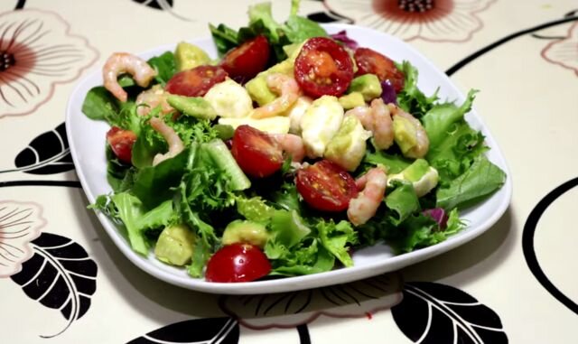 Этот рецепт оценят те, кто следят за фигурой. Блюдо получается легким. Никаких майонезных соусов, только легкая заправка. Креветки — как качественный белок, авокадо — отличный источник клетчатки и витаминов. Что касаемо сыра, можно использовать традиционный Фета, но на мой взгляд, с Моцареллой вкус получается более мягким. 🔥 Лучшее в телеграм: Посмотреть Ингредиенты: Для заправки: Способ приготовления: Очень тщательно выбирайте плод авокадо. Он должен быть зеленого или коричневого цвета. На ощупь не должен быть рыхлым, если прижать его со стороны, которая крепится к ветке, плод может слегка примяться. Шарики сыра разрежьте пополам. Тоже самое проделайте и с помидорами-черри. Плод авокадо разделите на две части, удалите косточку и нарежьте небольшими кубиками не касаясь самой шкурки, соберите мякоть ложкой. Соедините все ингредиенты в салатнике и добавьте креветки. Растительное и оливковой масло смешайте с соком лимона, добавьте специи по вкусу и заправьте блюдо. Хорошо перемешайте. На