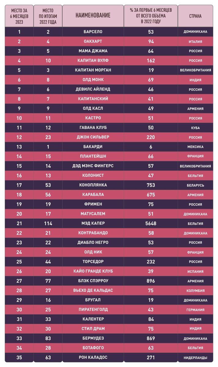 Ром ТОП 35 в 2023 году. Результаты продаж за первые 6 месяцев 2023 года.