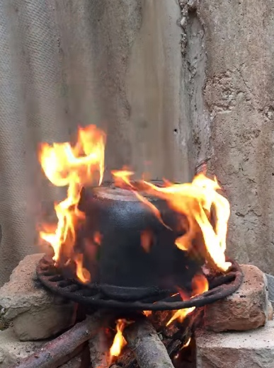 стоит над огнём на двух кирпичах. Казан постепенно темнеет.