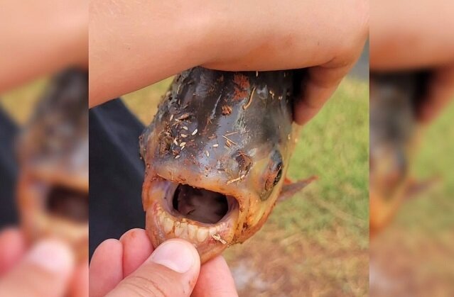 Юный рыбак из штата Оклахома поймал редкую рыбу с «человеческими зубами», похожую на пиранью. Это бурый паку — инвазивный вид проник в США из Южной Америки. Бурый паку — род рыб семейства Serrasalmidae. Близкие родственники пираний обитают в Южной Америке, и попадают пресноводные водоемы США, когда люди содержат их в качестве домашних животных, но выпускают в близлежащие пруды и реки. По всей видимости, так произошло и с экземпляром из Оклахомы. Ребенок вытащил из соседнего пруда рыбу с серо-оранжевой чешуей и широко раскрытым ртом, обнажающим ряд зубов, похожих на человеческие. Трофей показали сотрудникам Департамента охраны дикой природы, которые и подтвердили необычный улов. Вид паку, пойманного мальчиком по имени Чарли, пока неизвестен. Представители рода могут вырастать до 1 м в длину и весить 40 кг. Несмотря на внешнее сходство с пираньями, паку безвредны для человека. Их зубы, похожие на человеческие, скорее всего, стали результатом разнообразной всеядной диеты, включающей мелку