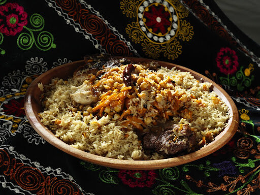 Простые и всем понятные продукты: растительное масло, горох-нут, мясо, немного сала, острый перец, лук и много моркови. Рис и единственная специя - зира - подразумеваются сами собой! Луковицу в масле в прежние времена обжаривали для того, чтобы исправить вкус хлопкового масла. Я готовил на масле из виноградных косточек, которое обладает идеальным вкусом, но луковицу все же обжарил - масло в результате приобрело характерный запах. Лук после обжарки выбрасывают, его миссия окончена. Нагрев казана максимальный! Мясо крупными кусками и немного лука полукольцами обжариваются вместе. Мясо обжаривается до уверенной корочки. Не забудьте как следует посолить! Закладываем половину моркови, горох, перчики и барбарис (без которого можно и обойтись). Все добро укрывается второй порцией моркови. Морковь не солим! Зато подливаем немного - буквально пару стаканов - воды. От этого приподнимается уровень масла, в результате чего часть моркови отдает ему свой вкус. А на пару готовится горох и остальная ч