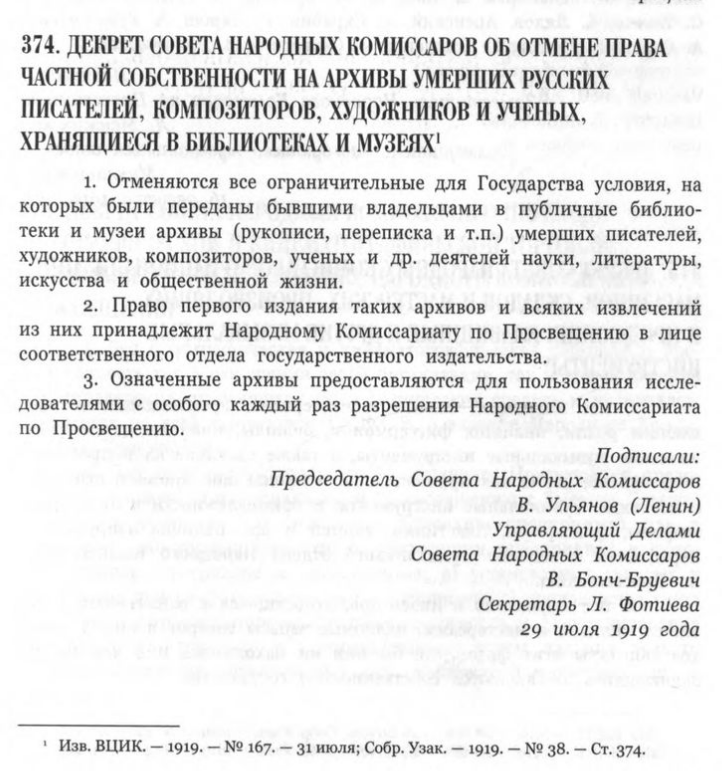 Декретом СНК отменено право частной собственности на архивы писателей, композиторов, художников и ученых, хранящиеся в библиотеках и музеях.