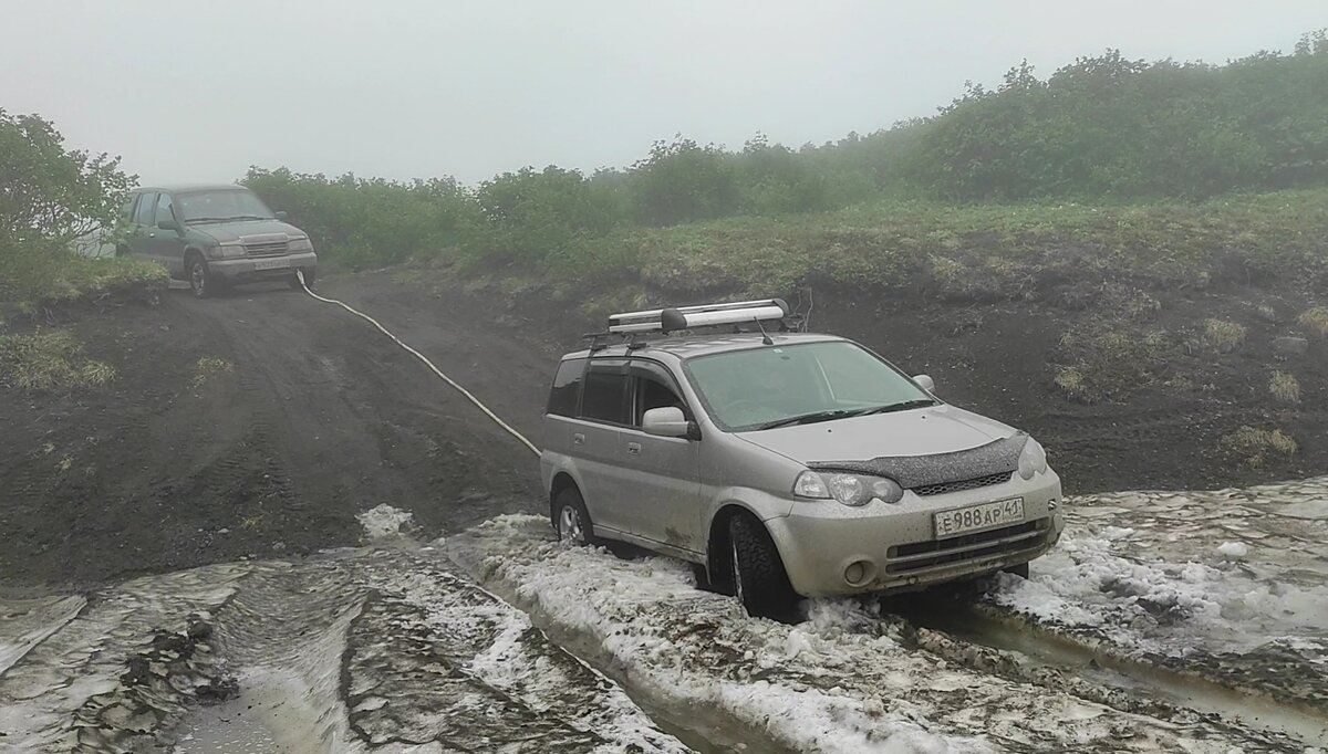 Национальным развлечением на Камчатке, как я успела заметить, является вытаскивание автомобилей друг друга. У меня материалов видео съёмки хватит на целый фильм про преодоление снежника. В нем сначала застряли мы, нас успешно вызволили, потом джип Suzuki Jimny, мы попытались его вытащить, но вместо этого застряли повторно.