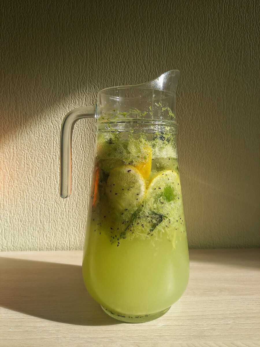 Нам понадобится: 1. Киви 2. Цитрусы: лимон, апельсин, лайм. Бери, что любишь. Лучше сочетать минимум 2 фрукта 3. Свежая мята 4. Газировка (бери без красителей) 5. Лёд Рецепт простой, справится и ребёнок. 1) Киви нужно измельчить до состояния пюрешки. Если нет блендера - натри на тёрке. Сразу наливаем в графин. 2) Нарежь тонкими ломтиками цитрусы 3) Мяту слегка потолочь (мадлим, как настоящие бармены). Кладём в графин 4) Засыпаем в графин лёд 5) Добавляем наши цитрусы 6) Заливаем газировкой Готово! Так гораздо вкуснее и полезнее🥰