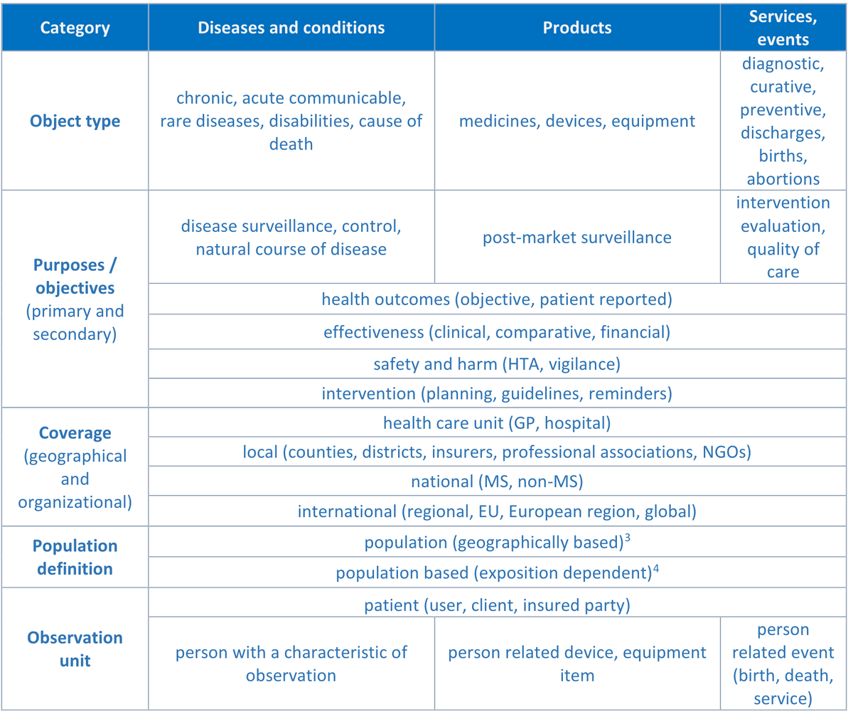 ISPOR описывает регистр, как «проспективное обсервационное исследование субъектов с определенными общими характеристиками, которое собирает текущие и вспомогательные данные с течением времени по четко определенным результатам, представляющим интерес для анализа и отчетности».