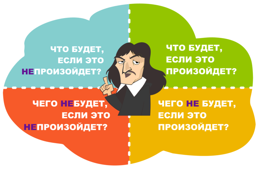 В жизни современного человека приходится принимать много решений, и не все они простые. Некоторые могут быть простые по типу того, что я хочу съесть сегодня на завтрак и приниматься автоматически, и выбрать тоже самое, что и вчера - омлет. А какие-то очень серьезные, как например, стоит ли уходить со стабильной работы с фиксированной оплатой на более интересную и на начальном этапе менее высокооплачиваемую? И тут уже принять автоматически это решение не получиться, нужно сравнивать и находить более перспективное решение. Для принятия решений отлично подходит классическая техника - квадрат Декарта. Она является предельно простой техникой принятия решений. При помощи квадрата Декарта легко установить наиболее значимые критерии выбора, а также оценить последствия любого варианта принимаемого решения. Для того, чтобы применить эту технику нужно 15 минут свободного времени, ручка и листок. В заглавии этого листа напишите тот вопрос, который является предметов ваших рассуждений. Работа с ква