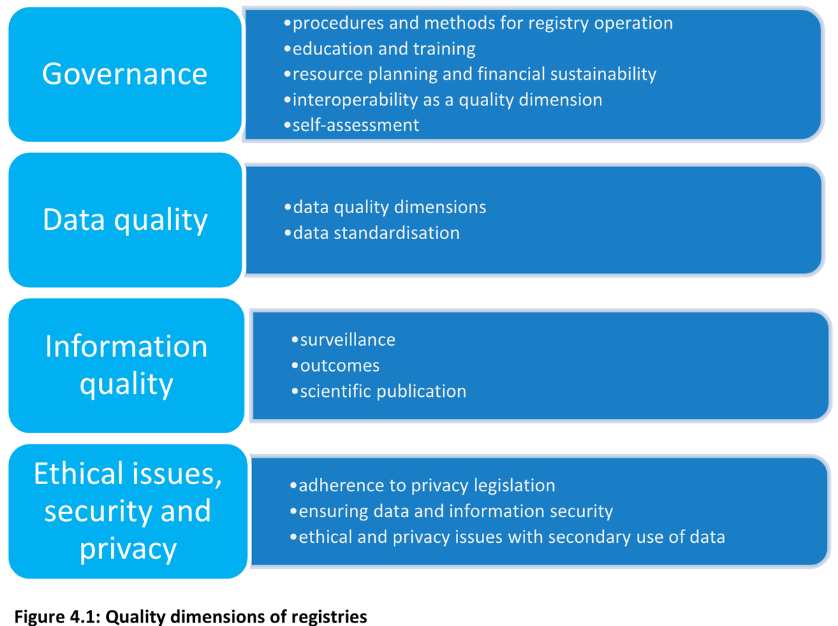 Одна из ролей управления регистром должна заключаться в рассмотрении того, как обеспечить общее качество до уровня, достаточного для намеченных целей; поэтому регистры должны уделять пристальное внимание вопросам обеспечения качества. Чтобы обеспечить регистрацию соответствующих пациентов и точность собираемых данных. Мероприятия по обеспечению качества могут помочь выявить проблемы с качеством данных, возникающие в результате неадекватного обучения, неполного выявления случаев или выборки, неправильного понимания или неправильного применения критериев включения/исключения или неправильной интерпретации элементов данных, и, следовательно, улучшить общее качество данных регистра.