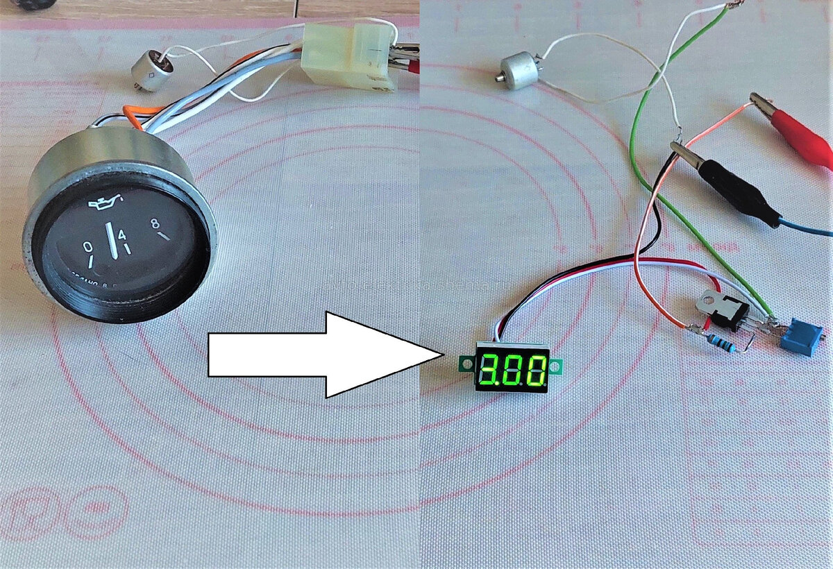 Стрелочный прибор давления масла можно встретить только на стареньких или спортивных автомобилях. Если установить такой прибор дополнительно, то он будет выделяться на фоне торпедо и выглядит это не очень гармонично. Но если сделать его миниатюрным и цифровым, то он поместится например в заглушке от кнопки. Схема простая, но датчик давления масла от "Шестёрки" уже не подойдёт, так как он уменьшает своё сопротивление с ростом давления масла, а с цифровым нужно наоборот. Можно купить нужный датчик или переделать старый, хотя он будет показывать правильно только в узком диапазоне, но свою функцию будет выполнять. Об этом и не только читайте в разделе гаражных самоделок на сайте: https://www.avto-elektrika-shema.ru/index/cifrovoj_ukazatel_davlenija_masla/0-574