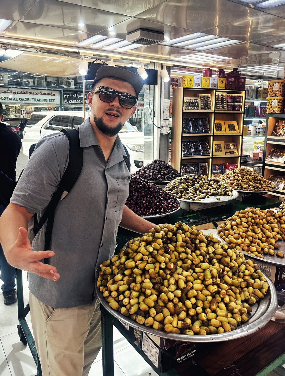ОАЭ – страна не из бюджетных, поэтому ожидать сладкий деликатес за копейки не приходится, но вы точно можете получить сладости по хорошей местной расценке и сполна насладиться их вкусом. А настолько сочных (по меркам сухофрукта), крупных и мягких фиников я не ел никогда. Всё просто тает во рту и сахарит душу. Да, такое удовольствие точно не для диабетиков. Сразу понимаешь, почему финики называют хлебом пустыни: вокруг ничего не растёт, а тут свисает целый комплексный обед в мягкой капсуле с хорошим набором калорий, который ещё и почти не портится.