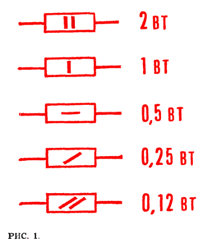 — Ну, не беда, место для всех найдётся. Только давай сначала разложим их по полочкам — посмотрим, где какая деталь применяется. Вот, к примеру, почему это зелёное сопротивление (кстати, их теперь принято называть резисторами) намного больше красного? Ведь, судя по цифрам на корпусе, их величина сопротивление и мощность рассеивания (величина максимальной электрической мощности, веселящийся на сопротивлении при работе схемы) у них одинаковы. Кстати, о требовании мощности рассеивания сопротивления. Она указывается в схеме на символически таком обозначении сопротивления (рис. 1). Две короткие прямые чёрточки требуют установки в эту часть схемы сопротивления мощностью 2 вт, одна черточка — 1 вт, одна длинная — 0,5 вт и так далее. Отсутствие чёрточек означает, что годится сопротивление любой мощности.