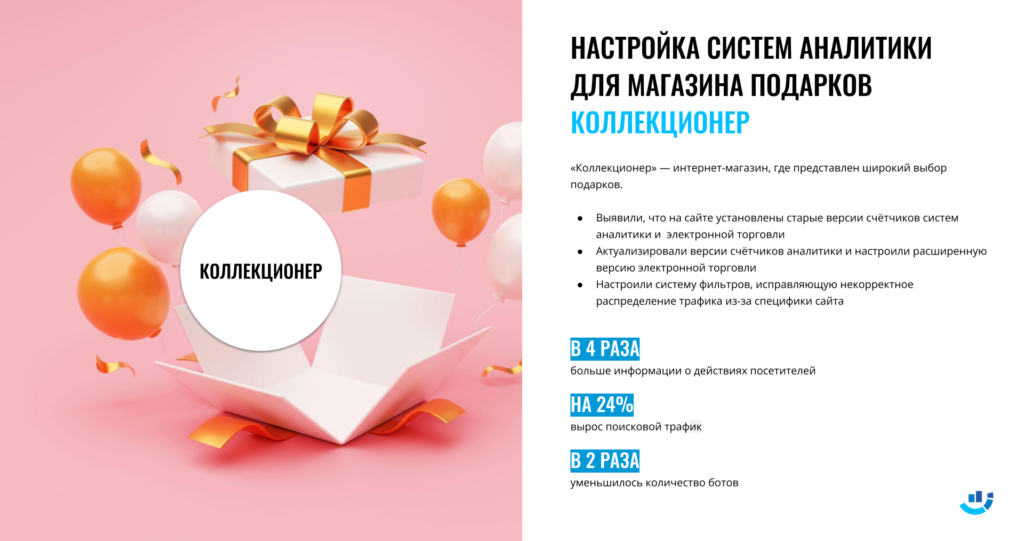 «Коллекционер» — интернет-магазин, где представлен широкий выбор подарков. Этапы работ Обновление счётчиков аналитики На сайте клиента были установлены устаревшие версии счётчиков систем аналитики и электронной торговли, что привело к сбору неполной и недостоверной информации о поведении пользователей и продажах. Мы актуализировали версии счётчиков аналитики, чтобы точно отслеживать и анализировать данные о посещаемости, конверсии и других важных метриках. Расширенная электронная торговля Настроили расширенную версию электронной торговли для получения точных данных о поведении пользователей — как они добавляют товары в корзину и как оформляют заказ. Благодаря этому мы узнали о предпочтениям и потребностях клиентов и смогли определить, как эффективнее проводить юзабилити-аудит. Система фильтров Настроили систему фильтров, исправив тем самым некорректное распределение трафика. Теперь посетители легко находят подарки, используя удобные фильтры по категориям, ценовому диапазону, брендам и