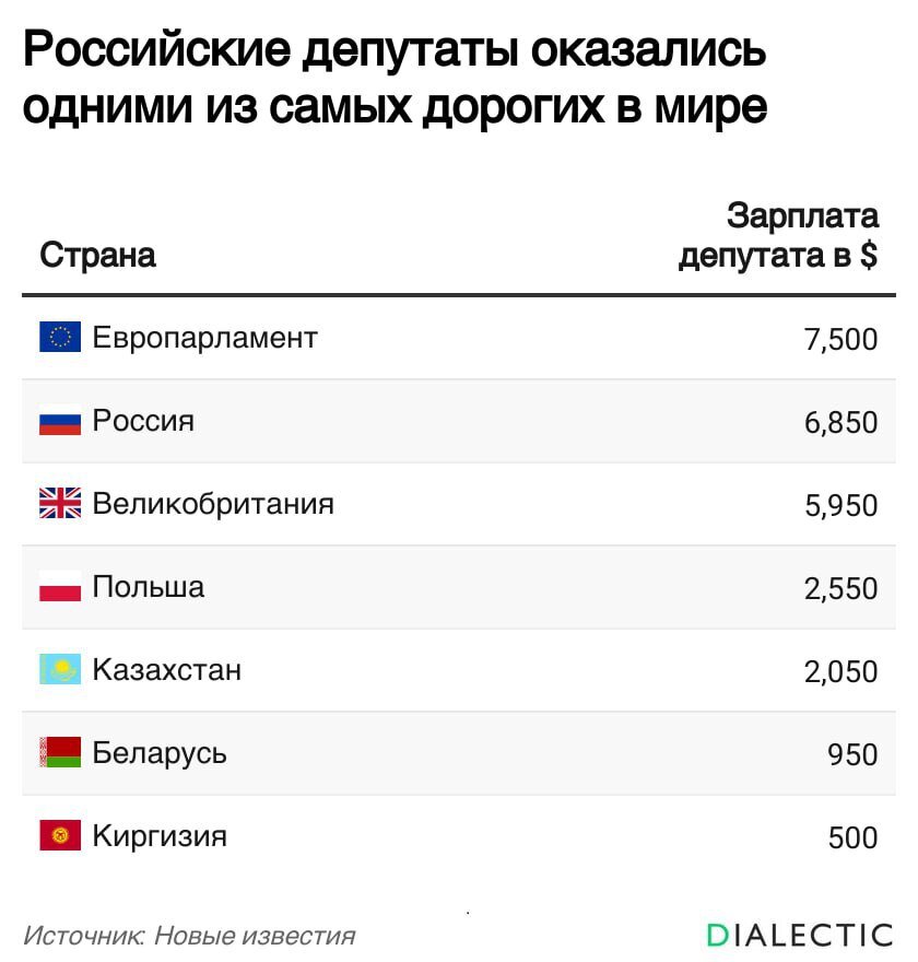 У всех остальных запросы и возможности куда скромнее. В бывших советских республиках официально получают на порядок меньше. Только в Казахстане депутатам платят $2050, а вот в Киргизии их зарплата составляет не серьезные по российским меркам $500 в месяц.