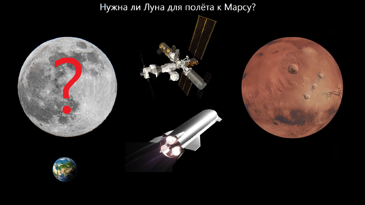 И как мы видим, полёты к Луне оправданы, только если мы и летим именно к ней. Если же нам нужно добраться до Марса, эффективнее всего будет лететь сразу на Марс, никакие пересадки и передозаправки на Лунной орбите не нужны (как и в целом сама окололунная станция "Lunar Gateway").