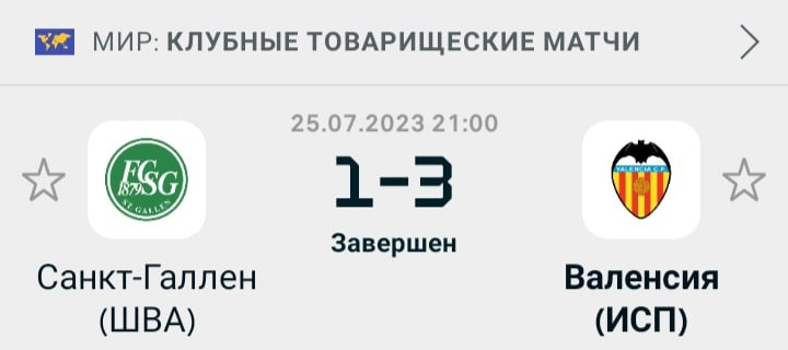 Привет друзья. Сегодня я для вас разберу товарищеский матч между командами Валенсия и Санкт - Галлен. Команды уже играли между собой на прошлой летней предсезонной подготовке. Тогда Валенсия победила со счётом 2 : 0. У Санкт - Галлена было небольшое преимущество перед Испанской командой. Дело в том, что Швейцарский клуб этим летом провёл уже 5 контрольных матчей, а Валенсия только 2. При этом Летучие мыши были фаворитами в данном матче. Оно и понятно. Ведь чемпионат Испании входит в топ - 5 лиг Европы, а чемпионат Швейцарии нет. Данная лига известна тем, что сюда приезжают футболисты на закате карьеры. Разбор матча. Валенсия в самом начале поединка пропустила необязательный гол. Марио Стефанович на 4 минуте отправил мяч между ног Хауме Доменека. После этого Валенсия завладела инициативой и начала создавать моменты у ворот соперника. Это помогло летучим мышам совершить камбэк ещё до перерыва. Валенсия умудрилась забить 2 мяча за 3 минуты. Отличились Димитрий Фулькье и Альберто Мари. Во
