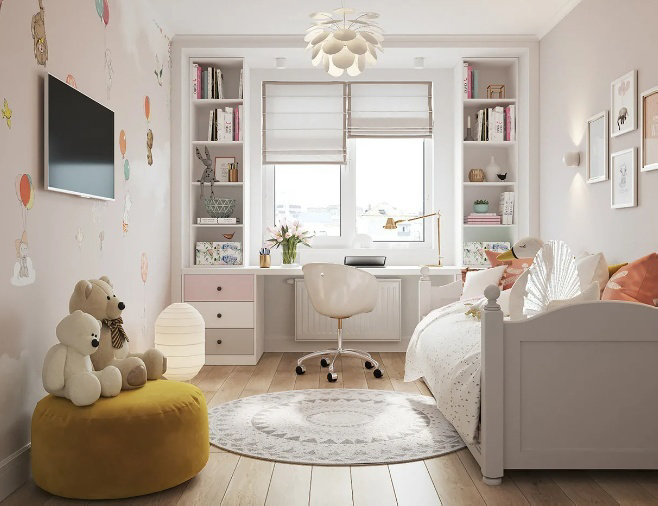 Функциональное разделение детской выполняет несколько задач: Современные варианты планировки детской позволяют воплощать различные идеи со множеством особенностей. Итак, какие же бывают зоны: • Место для игр • Детское место для активных игр требует выделения достаточной территории. Лучше, если платформа будет расположена в центре, в районе окна. Безусловно, в этом участке должен быть ковер, емкости и полки для игрушек. Для удобства можно установить журнальный стол или детскую мебель. • Место для отдыха • Участок будет содержать кровать, но желательно разгрузить пространство от другой мебели. Освещение предпочтительно слабое, можно установить настольный светильник, бра, ночник или точечные потолочные элементы. Свет может быть цветным. У кровати можно поставить тумбу для книг. • Место для развития • Для любого ребёнка важно развитие. Оно достигается не только посредством игр, но и в ходе различных творческих, умственных занятий. Для этого организуется рабочий стол, где можно рисова