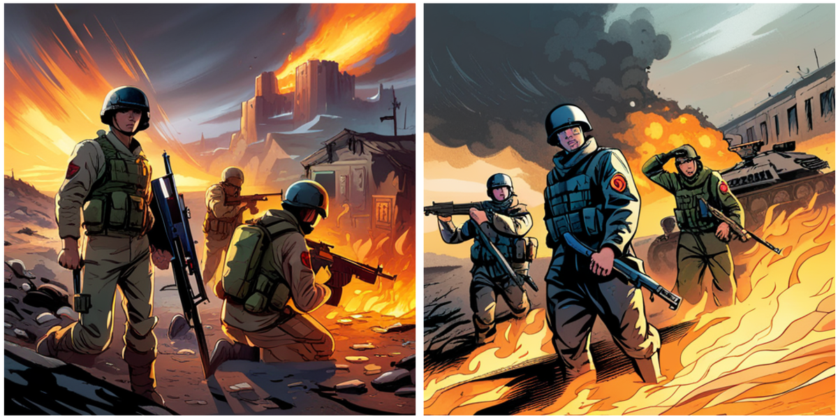 «Утраченные надежды» На поле боя раздаются последние выстрелы, звучат крики и стоны раненых солдат. Солдат 1: (измученно) —Это уже слишком долго продолжается... Солдат 2: (подавленно) —Мы потеряли слишком много хороших людей... Появляется миротворческая миссия, состоящая из представителей разных стран. Дипломат 1: (серьезно) —Время прекратить этот ужас! Дипломат 2: (грустно) —Мы должны найти путь к мирному разрешению конфликта. Дипломаты проводят сложные переговоры, но не могут прийти к единому решению. Дипломат 2: (расстроено) —Нам не удается достичь соглашения... Дипломат 1: (уныло) —Каждая сторона так утверждает свою правоту. Вооруженные стороны возобновляют боевые действия с новой силой. Солдат 1: (зло) —Мы не можем позволить им навязать свою волю! Солдат 2: (печально) —Но мы должны остановить этот бесконечный круг насилия... На поле боя оказывается женщина с маленьким ребенком. Женщина: (плачет) —Почему моему ребенку приходится страдать из-за войны? Военные вспоминают ранее умерши