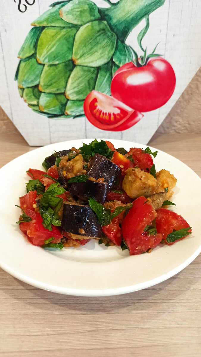 Предлагаю вашему вниманию очень простой, красивый и вкусный салат из "синеньких", так их называют в простонародье. Тофу, который добавляется в салат впитает в себя весь сок овощей и будет передавать его во всей полноте. Способ приготовления: 1. Овощи необходимо все помыть, зелень петрушки замочить в воде с добавлением соды. 2. У баклажан срезаем с двух сторон попку и плодоножку. Можно снять с него шкурку ножом для овощей. Разрезаем его на пополам и нарезаем небольшими квадратами. 3. Тофу режем тоже на небольшие кубики. 4. Теперь необходимо и баклажаны и тофу обвалять в мучно-крахмальной смеси, для этого складываем их по отдельности в целлофановые пакеты и в каждый насыпаем по 1 столовой ложке муки и любого крахмала. Пакеты закрываем и аккуратно трясем их переворачивая верх вниз. Затем открываем пакеты и стряхиваем с баклажан и тофу лишнюю муку с крахмалом. 5. Ставим разогреваться 2 сковороды и наличием в них растительное масло. В каждую из которых выкладываем баклажаны и тофу для обж
