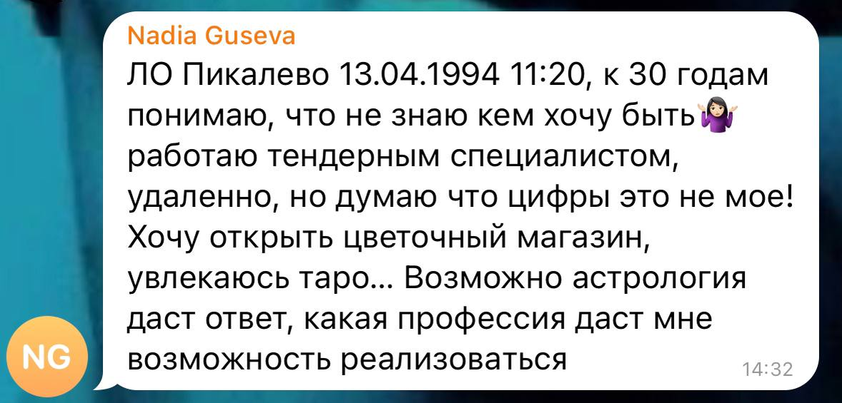 Надя выбирает между тендерным специалистом (вроде работает, есть опыт, я так понимаю, но цифры надоели, «не мое» пишет), увлекается Таро, хочет открыть собственный цветочный бизнес.