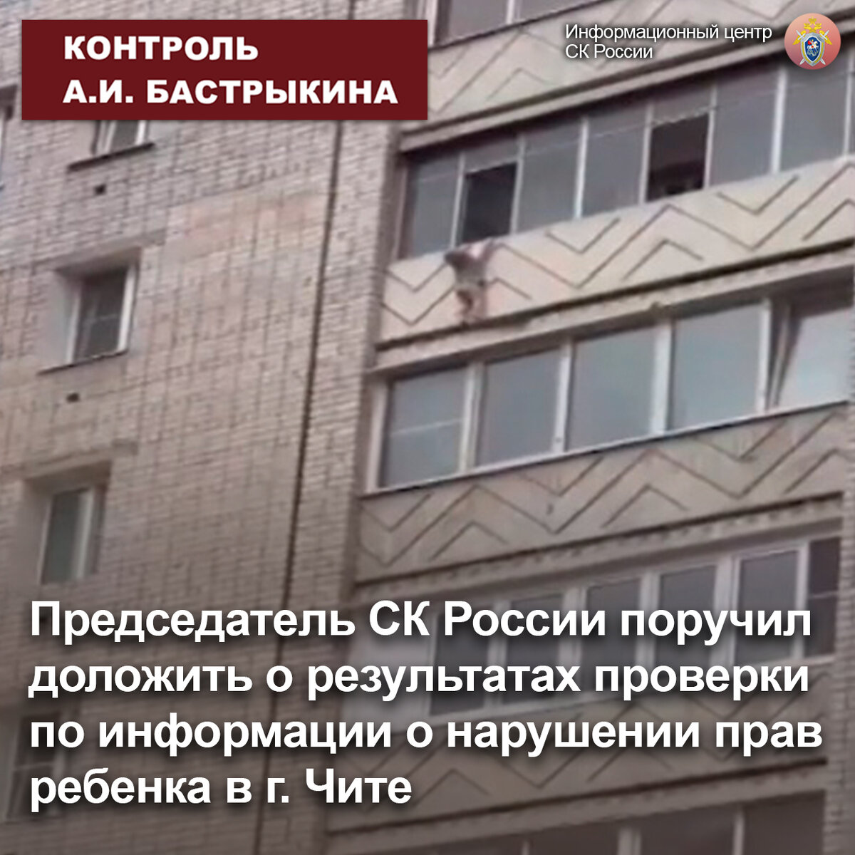 В эфире федерального телеканала сообщалось о ненадлежащем исполнении родителями обязанностей по воспитанию трехлетнего мальчика в городе Чите Забайкальского края. В августе текущего года ребенок вылез в окно балкона на седьмом этаже, когда его мать спала после употребления алкогольных напитков. Ребенка удалось спасти. Семья длительное время состоит на учете как неблагополучная, ранее с жалобами о конфликтах в ней жильцы дома неоднократно обращались в компетентные органы. В настоящее время указанный мальчик и еще один ребенок из семьи изъяты органами опеки и попечительства.