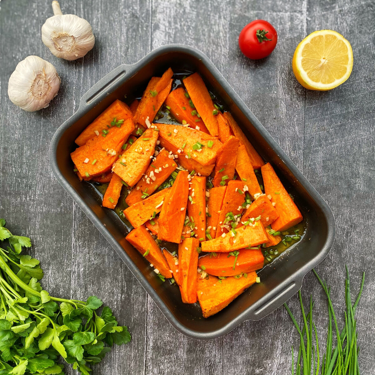 🥔Из батата (сладкого картофеля) можно приготовить и множество различных вторых блюд. Он растёт на Кавказе, в Краснодарском и Ставропольском крае, в Башкортостане и в Хакасии, - в общем везде, где тепло. Сегодня запекаем батат дольками с пряностями, обязательно с чесноком и оливковым маслом. По вкусу это блюдо напоминает картошку по-деревенски, только немного со сладковатым вкусом.