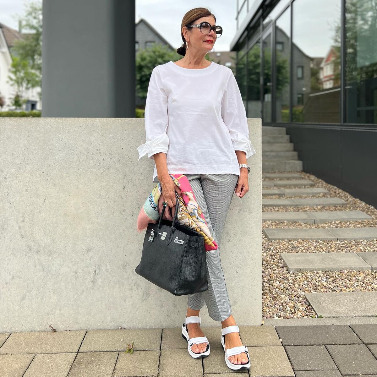 Говорят, что август пахнет осенью. Тем не менее последний месяц лета еще порадует нас жаркими деньками. Поэтому не прячем сарафаны и футболки на дальнюю полку шкафа, а наслаждаемся стильными идеями от модниц элегантного возраста! Белый «верх» + серые брюки + черно-белые сандалии – простой и понятный сет на каждый день. Практичный комплект удачно завершает сумка-тоут и освежающий платок с принтом. Если выбор пал на шорты, важно подобрать модель свободного кроя. Бермуды идеально подходят дамам старше 50. Будет это вариант из плотного трикотажа, льна или денима – не имеет никакого значения. Лето – самое время создавать расслабленные, легкие наряды и дополнять их соломенными аксессуарами. Это может быть широкополая шляпа или плетеный аксессуар. Модницы со стройной фигурой не отказываются от одежды с воланами. Посмотрите, как стильно и выразительно на леди 50+ смотрится морковное платье с оборками. Ансамбль в светлых тонах – всегда хорошая идея! Белый в дуэте с небесно-голубым здорово освеж