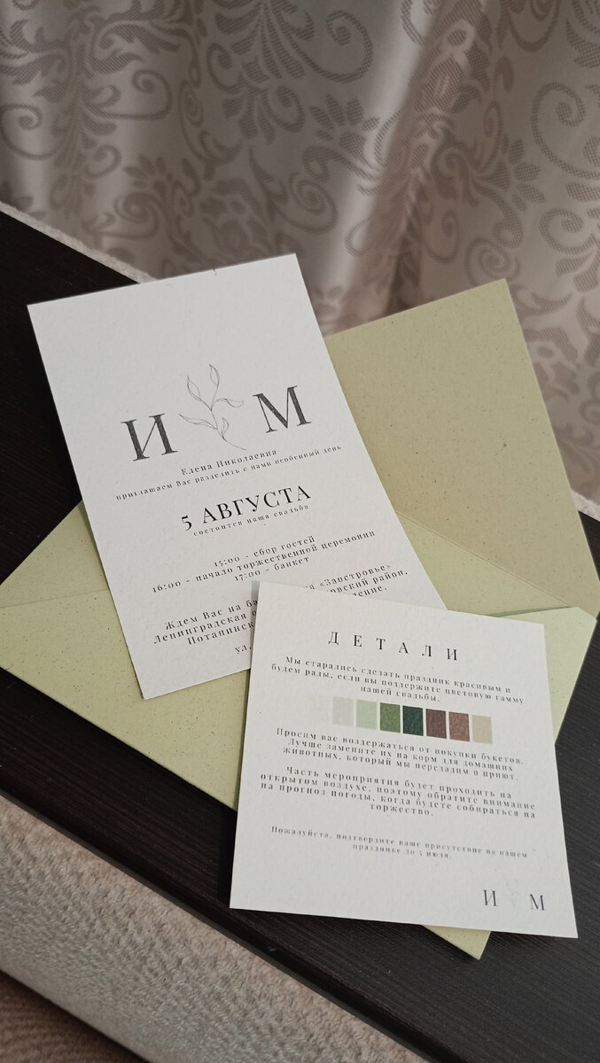 Конечно не моей. Замуж выходит моя внучка. А свадьба у них в стиле природном. Будет на природе ( берег озера Ладожского). Просят прийти в наряде определëнных цветов. Строго ограничений нет. Но всё же! Вот такой конвертик с приглашением получил каждый приглашëнный гость. Эти приглашения сама Машенька придумала и сделала. Всё строго и скромно, но мне дизайн этот очень нравится. Предложение принести вместо букетов корм для животных не дань моде. Я то знаю, что она посещает приюты для кошек и оказывает посильную помощь. Да и дома у родителей еë четвëртый год живëт кот Лютик ( Люцифер), которого Машенька привезла из Москвы в пандемию, когда им с подружкой пришлось уехать оттуда. Лютику очень повезло. Живëт "как в масле катается". Раздобрел. А ведь был котëнком, подкинутым в подъезд. Конечно я сама никогда на свадьбу с кошачьим кормом не ходила, но... А вообще и свадеб то я видела мало. Свою и своих детей. Пару раз в молодости на чьих то свадьбах с мужем была. Его знакомые с работ