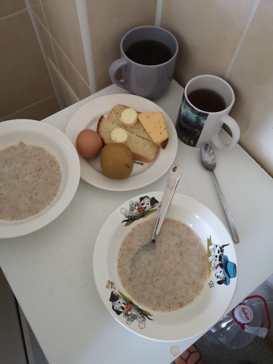 Это завтрак - овсяная каша, хлеб, немного сыра, яйцо.