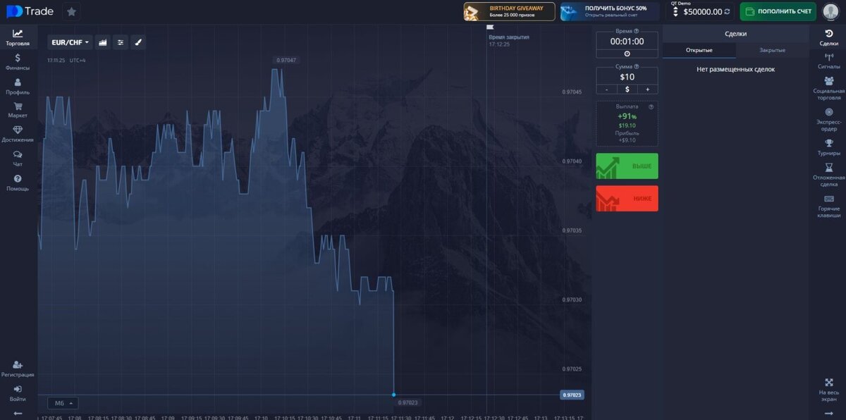 Типичная доходность золота, серебра - 88%, а доходность таких акций, как Pfizer и Intel, - около 90%. Quotex не взимает никаких торговых комиссий. Минимальный размер сделки составляет 1 USD.