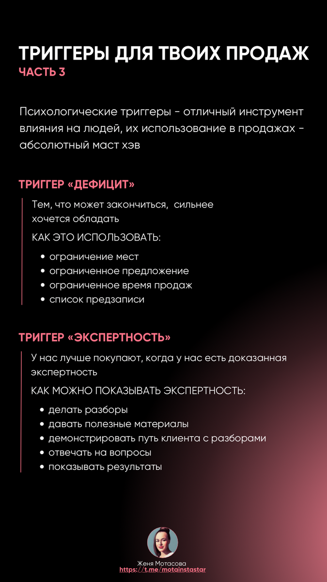 Психологические триггеры - отличный инструмент влияния на людей, их использование в продажах - абсолютный маст хэв ТРИГГЕР «ДЕФИЦИТ» Тем, что может закончиться, сильнее хочется обладать КАК ЭТО ИСПОЛЬЗОВАТЬ: - ограничение мест - ограниченное предложение - ограниченное время продаж - список предзаписи ТРИГГЕР «ЭКСПЕРТНОСТЬ» У нас лучше покупают, когда у нас есть доказанная экспертность. КАК МОЖНО ПОКАЗЫВАТЬ ЭКСПЕРТНОСТЬ: - делать разборы - давать полезные материалы - демонстрировать путь клиента с разборами - отвечать на вопросы - показывать результаты Больше советов, практик и рабочих схем по продажам в моем тг-канале, переходи по ссылке и подписывайся https://t.me/motainstastar