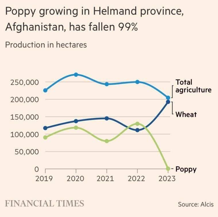 После ухода США из Афганистана, выращивание наркотического мака в стране упало до 0. Вместо этого, талибы начали сажать вдвое больше пшеницы.