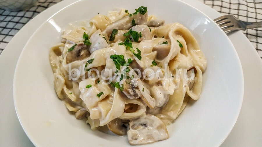 Пасту можно брать любую. У нас тут тальятелле, но ничто не мешает использовать фетучине, пенне и даже спагетти. Такая же история и с грибами. Шампиньоны — самое доступное, но если взять вешенки, а тем более, какие-нибудь благородные лесные, блюдо от этого только выиграет.