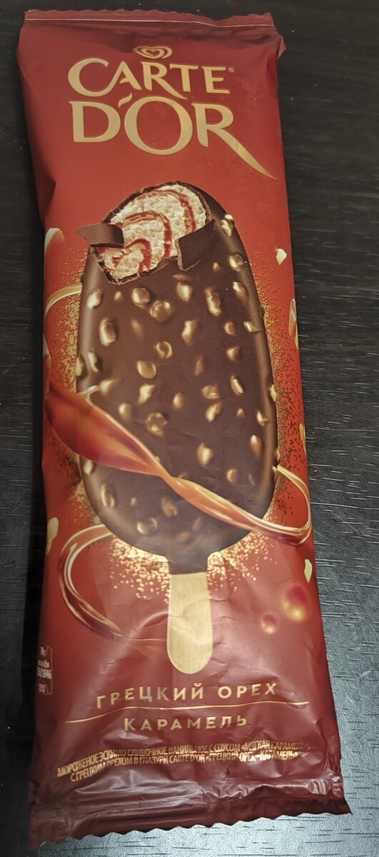 Традиционный пост о продуктах по субботам Так как на улице уже который день до +34 в тени, ни о чем невозможно думать в плане сладостей, кроме мороженого. Вот поэтому давайте расскажу о новинках, что начали продаваться в магазинах. Под маркой Carte D'Or "Инмарко" сейчас продаёт только 2,5-3-килограммовые контейнеры с разными вкусами. И вот неожиданно в продаже появилось мороженое эскимо этой марки. Видимо решили, что «Магната» недостаточно для премиального сегмента в разовых упаковках, и теперь вот Carte D'Or, правда лишь с одним вкусом. Раньше вариантов было больше: бочонки, например. Позиционируется как нечто французское. Состав хороший (почти). Мороженое сливочное. Сгущёнка на кокосовом молоке. В качестве глазури — молочный шоколад. Правда с заменителями какао-масла. Внешний вид попроще, чем у «Магната». Тем не менее грецкого ореха не пожалели. Внутри прожилки карамельной начинки. А вот и новый вкус от марки «Магнат» этого же производителя. Ценовая категория та же. Всё усложняется.