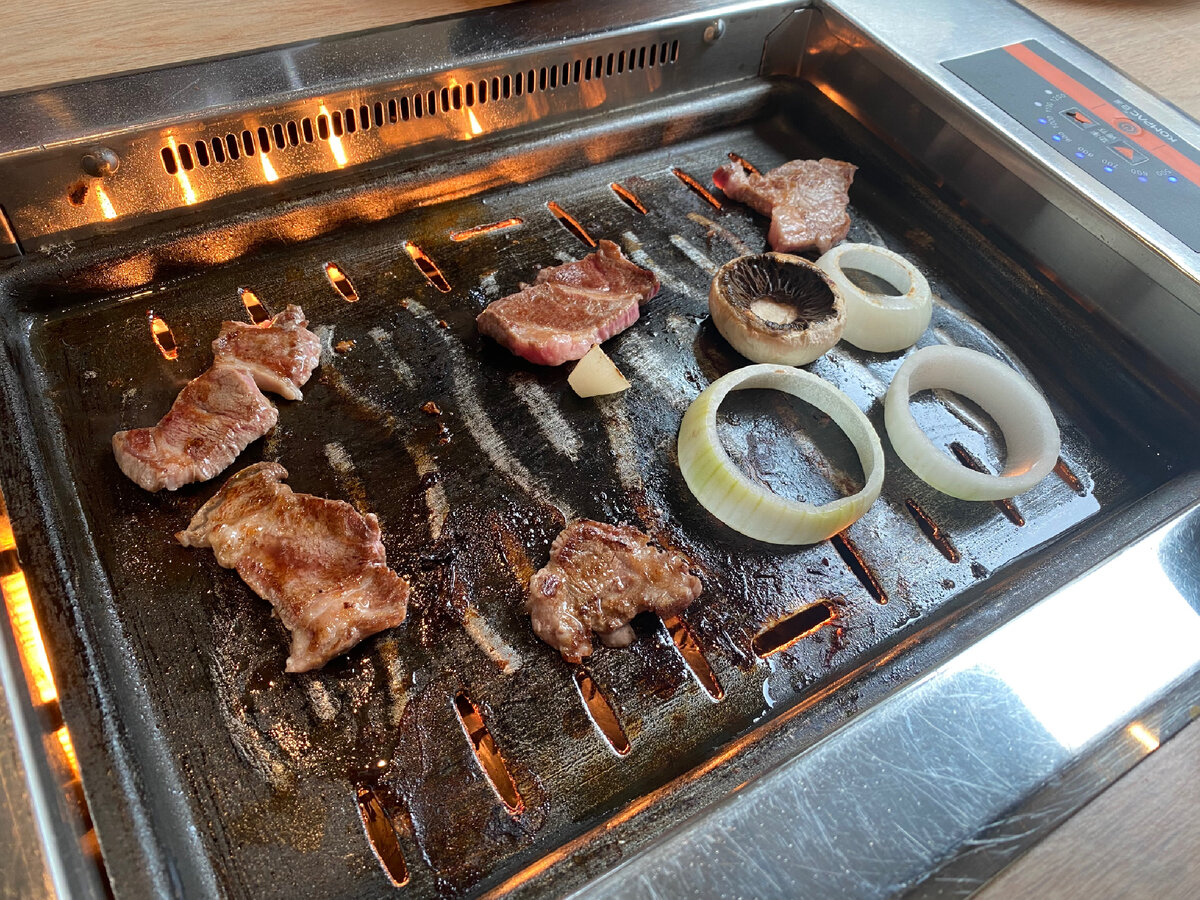 Прикол еще в том, что куски мяса надо брать щипцами и отрезать ножницами, чтобы зажаренные кусочки ровно годились для укладки в лист салата. В некоторых корейских ресторанах это делают официанты, но тут ты это делаешь сам. При этом можно попросить мастер-класс. И это очень увлекательная процедура. И мясо всегда с огня. И очень компанейское мероприятие. И вкусно. 5+