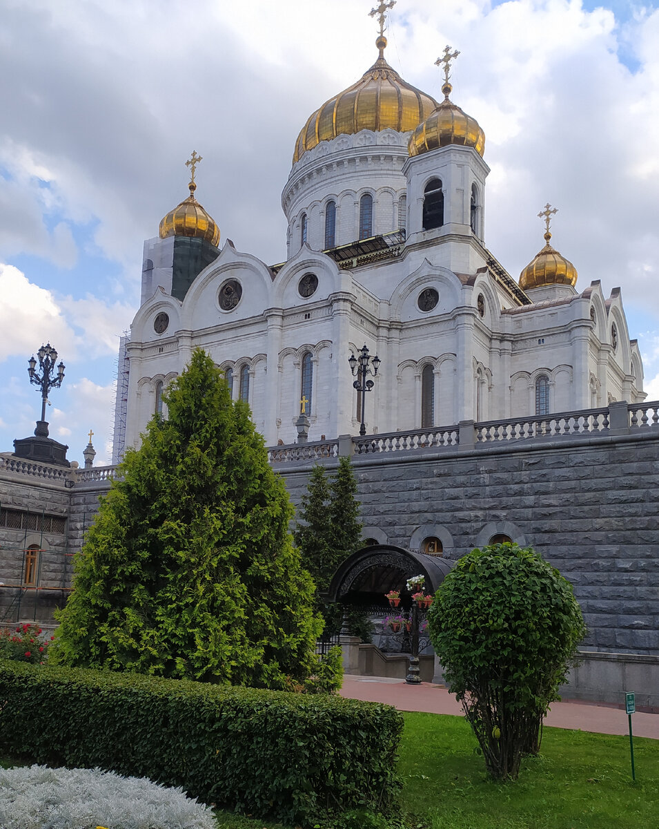 4 августа 2023 года Здравствуйте, друзья! Храм Христа Спасителя монументален и величественен. Его видно из многих уголков центра Москвы. Всем москвичам и гостям столицы будет интересно там побывать, но сегодня я не буду рассказывать о необычной и трагической истории строительства, сноса и воссоздания этого храма, так как собиралась я совсем даже не в храм. После работы, не последовав советам некоторых подписчиков, я вместо тихого домашнего вечера, решила пройтись по Бульварному кольцу, хотя бы частично. Но доехав до метро Кропоткинская, откуда и начинается Бульварное кольцо, я вышла не в ту сторону и оказалась... Вот он Храм, справа от меня. А я нахожусь в уютном сквере, расположенном с его обратной, непарадной стороны. Сквер (буду его так называть, кто знает, как правильно - пишите в комментариях), находится как бы в "чаше", видимо "на дне" бывшего бассейна "Москва", который просуществовал на этом месте до начала 90-х годов прошлого века. Много зелени, цветов, лавочек для отдыха. Ух