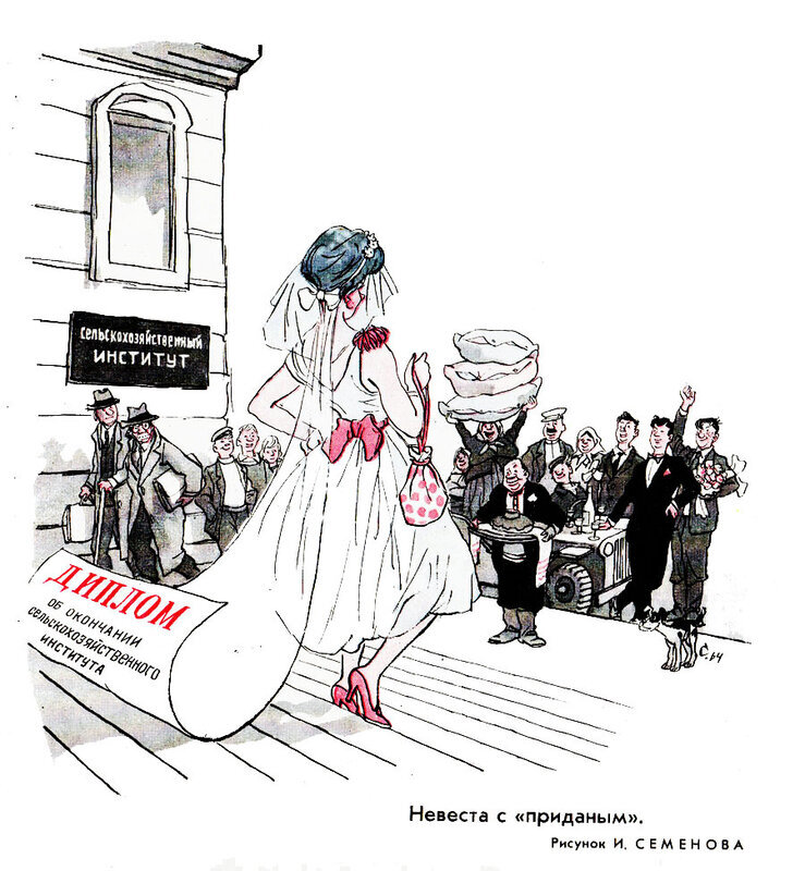 Время идет вперед, а проблемы супружества практически не меняются. Поэтому карикатуры, созданные несколько десятилетий назад, и сейчас большей частью актуальны. Вот как встречают дипломированную специалистку Сельскохозяйственного института. Лишь бы согласилась ехать в глушь. Но что-то вид у нее слишком примодненный. Такая может и не согласиться. Интересная идея - перед вступлением в брак дать молодым возможность заняться домашним хозяйством. А тут предсвадебные страдания. Так хочется праздника даже в браке. Ну и извечная тема, жениха в ЗАГС просто так не заманишь. Много карикатур посвящено теме неравного брака. У меня их три в этой публикации. Ну и скороспелым бракам тоже досталось. И такая позитивная карикатура под конец. Тут все счастливы. Всегда рада вашим комментариям и лайкам. Подписывайтесь на канал. #карикатуры #свадьба #ЗАГС #семья #юмор #сатира