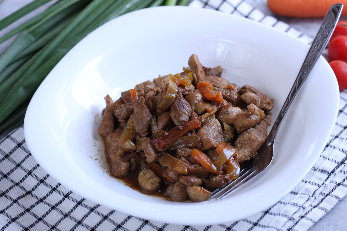 Как-то недавно я приготовила это блюдо, с тех пор оно очень полюбилось и прижилось у нас в семье. Готовится оно просто, но получается очень вкусно. Весь смысл в оригинальном соусе. Я готовила с шампиньонами, но если их заменить на лесные грибы, то получится еще вкуснее. И если брать шампиньоны, то мини будет смотреться в готовом блюде более красиво. Полный список ингредиентов в конце статьи. Свинину нарезать небольшими кусочками. Грибы нарезать четвертинками или пластинами (зависит от размера грибов), перец и морковь нарезать брусочками.