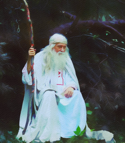 Сквозь толпу неспешно ступал седой, косматый старец в серых длинных одеждах, подпоясанный веревкой и опирающийся на длинный посох.