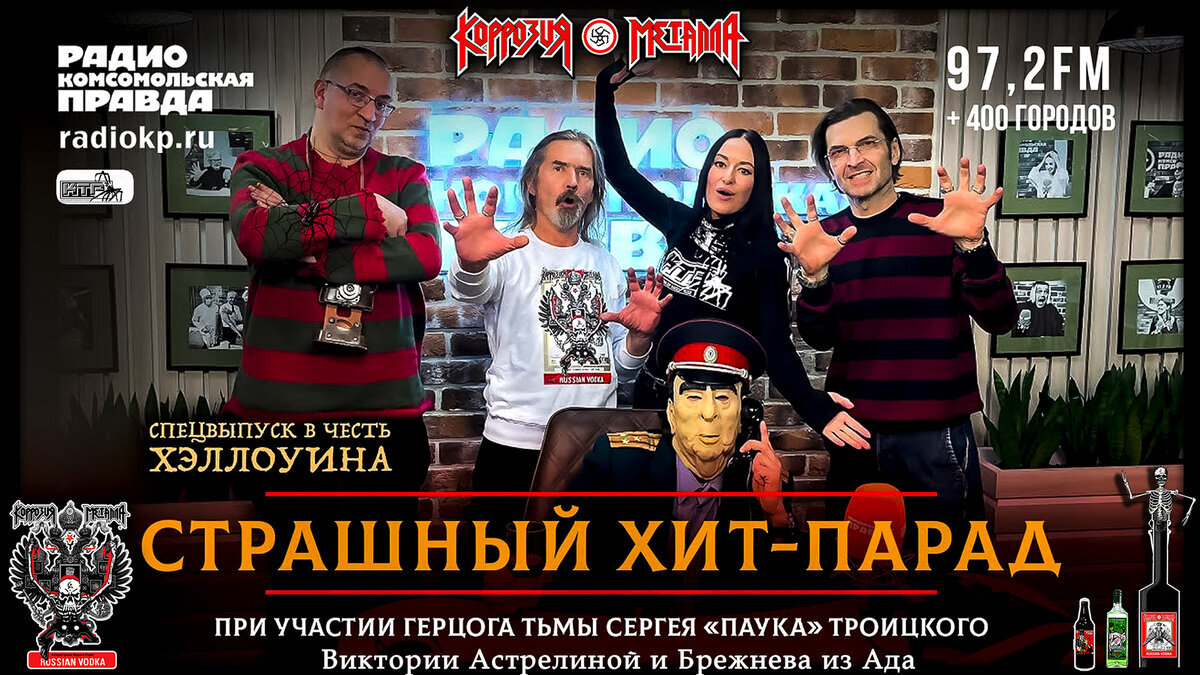 Великий хит группы КОРРОЗИЯ МЕТАЛЛА занял первое место в Хеловин хит параде Комсомольской Правды. Супер боевик, обогнал Совдеп – идолоф Земфиру, Алису, ДДТ и ЧАЙФ. На седьмой позиции, совместный боевик Дельфина и ПАУКа – ЛЕНИН В КЕПКЕ. Хит парад - Ацкого Хеловин Викенда на радио Комсомольская Правда / От Сергея ПАУКа – граф DRACULA MSC, Богини Морга – Виктории Астрелиной, Брежнева из Ада, при участии Михаила Антонова и Александра Анатольевича с МТВ. О том, как комсомолки должны жечь в избах китайцев. Как школьники и детвора должны праздновать Хеловин, как его отмечали в СССР. Телемост с Горшком из потустороннего мира, шутки и прибаутки от Ильича, романсы и баллады от Виктории. И шквал забойного трэша от королей тяж-мета – группы КОРРОЗИЯ МЕТАЛЛА. Лидер хит парада со своим нетленным хитом - RUSSIAN VODKA. За который проголосовали 666000 пользователей со всего мира. На радостях от победы в хит параде КП, ПАУК и Дембель, всем журналисткам КП раздали по батлу пива DRACULA. А вокалистка Кор