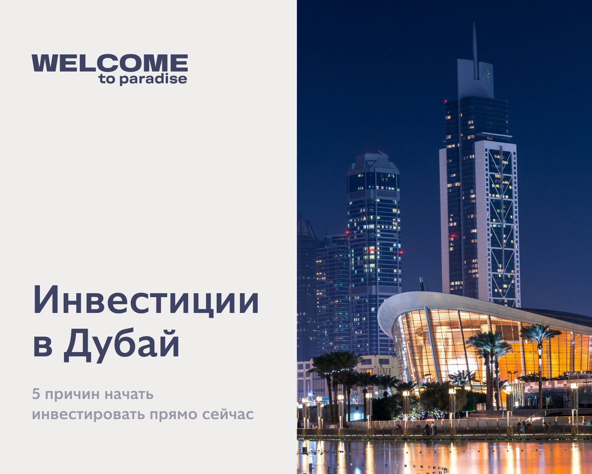 Инвестиции в недвижимость Дубая — одна из наиболее привлекательных возможностей на данный момент. Крупнейший мегаполис ОАЭ не только отличает стабильно растущая экономика, благоприятный бизнес-климат и низкая налоговая нагрузка — в последние 2 года на рынке недвижимости наметился самый настоящий строительный бум. Почему инвестировать в недвижимость Дубая сейчас — выгодное решение? И еще несколько плюсов: Хотите узнать больше? Welcome To Paradise — надежное агентство для поиска недвижимости в Дубае. Подбираем объекты с максимальной доходностью и сопровождаем сделку на каждом этапе: от первого онлайн-показа до оформления права собственности. >> Получить консультацию