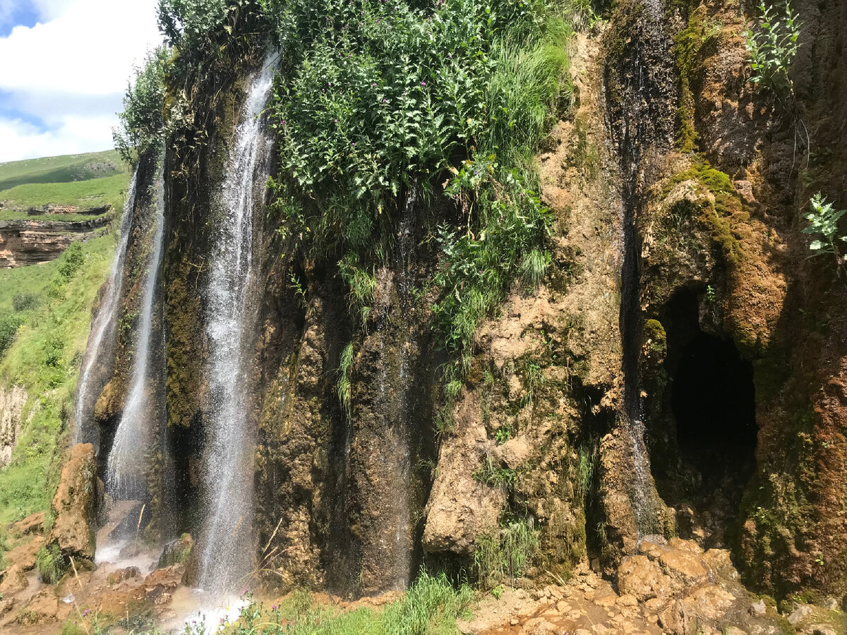 Вообще-то, вода здесь правда не обычная. Гидрокарбонатно-сульфатная кальциево-магниевая с минерализацией 0,5 г/л. Была бы минерализация чуть повыше – считалась бы нарзаном. Но ходят упорные слухи, что в разных водопадах вода отличается. Чаши, в которые падает вода – красные, бурые, розовые, камни радужно-рыжие. Налетает ветер, будто пролетает дух колдуна Черномора… Ведь откуда-то взял старец Финн волшебную воду для возрождения Руслана. Что было здесь в давно минувшие? Пещеры сложены из травертина. Этот камень есть только там, где источники углекислых вод. И в научной литературе, несмотря на огромное количество пещер на Кавказе - Гришнины называются единственными с своем роде.