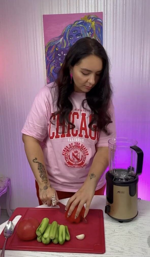 😋 Мои бриллианты, одно из любимых блюд этого лета помогающее мне стройнеть - гаспачо. Делюсь любимым рецептом: Ингредиенты: - 500 гр спелых помидоров 🍅 (по возможности выбирайте мясистые и сладкие помидоры) - 500 гр огурцов 🥒 - 1 красный перец - 1-2 зубчика чеснока - 1-2 столовые ложки оливкового масла - Соль и свежемолотый черный перец по вкусу - 0,5 столовой ложки уксуса - Свежая зелень (например, базилик или петрушка) для украшения Инструкция: 1. Приготовьте помидоры: залейте их кипятком на 1-2 минуты, затем обдайте холодной водой и очистите от кожицы. Нарежьте помидоры на четвертинки. 2. Огурец и перец тщательно вымойте и нарежьте кубиками. Чеснок измельчите. 3. Положите помидоры, огурцы, перец, лук и чеснок в блендер и измельчите до состояния пюре. 4. Добавьте оливковое масло, уксус, соль и перец в пюре из овощей. Перемешайте все ингредиенты до однородной консистенции. 5. Оставьте гаспачо в холодильнике на несколько часов или лучше на всю ночь, чтобы оно настоялось и все аромат