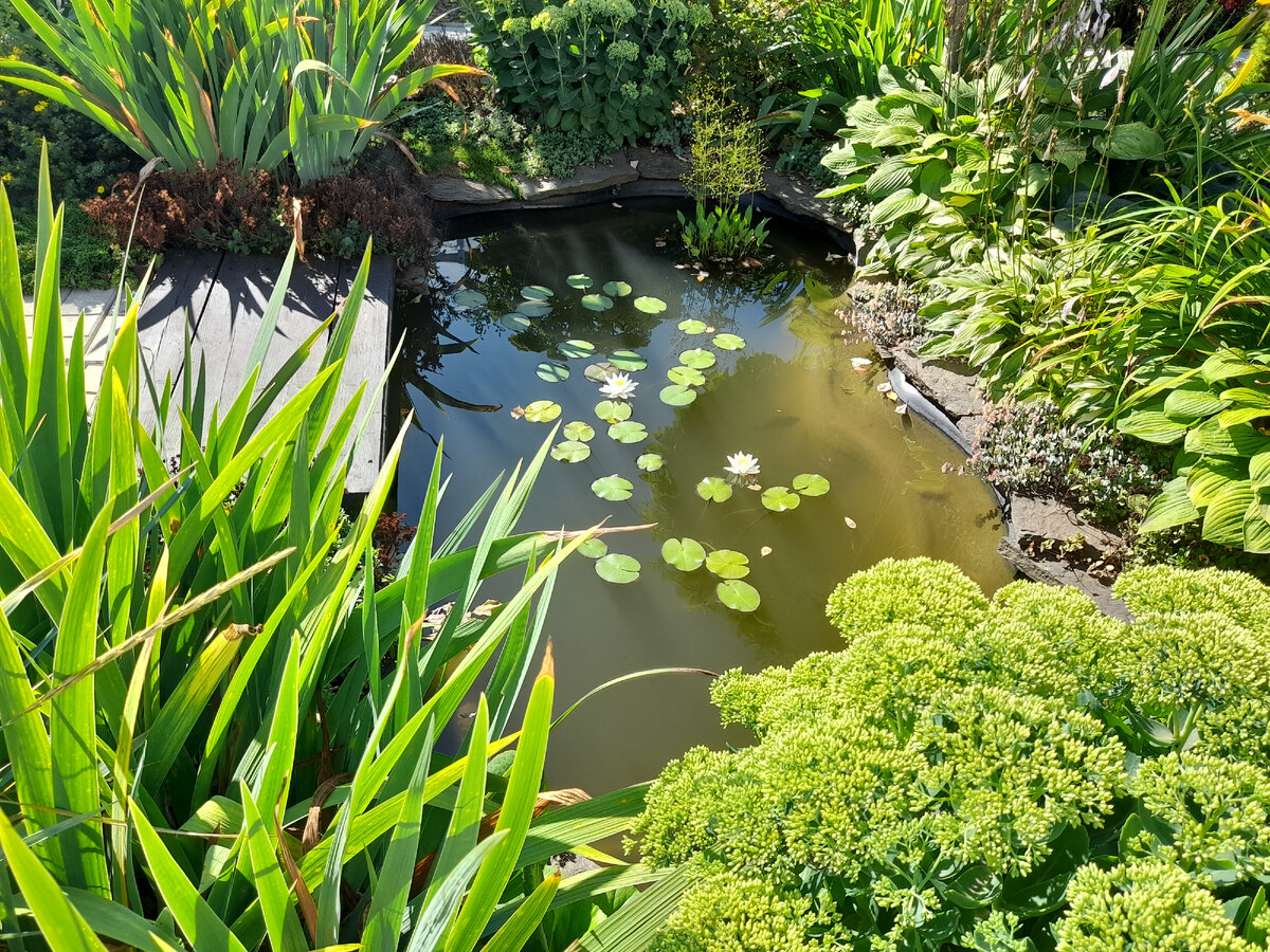 В этом году нимфеи зацвели очень поздно. Сейчас начало августа и я уже не надеялась увидеть их цветов. Я думаю причина в том, что осенью прошлого года я поделила свое взрослое растение. Теперь у меня две нимфеи и им нужно время окрепнуть. У меня некрупный сорт. Покупала я ее у женщины уже во взрослом состоянии. Женщина эта переезжала в другой регион и распродавала растения из своего сада. Нимфей у нее было несколько видов, но я успела урвать только один. С удовольствием бы поменялась с кем-нибудь на другой сорт, но пока такой возможности нет. Сегодня вода в пруду такая прозрачная, что видно постоянно прячущихся карасей.