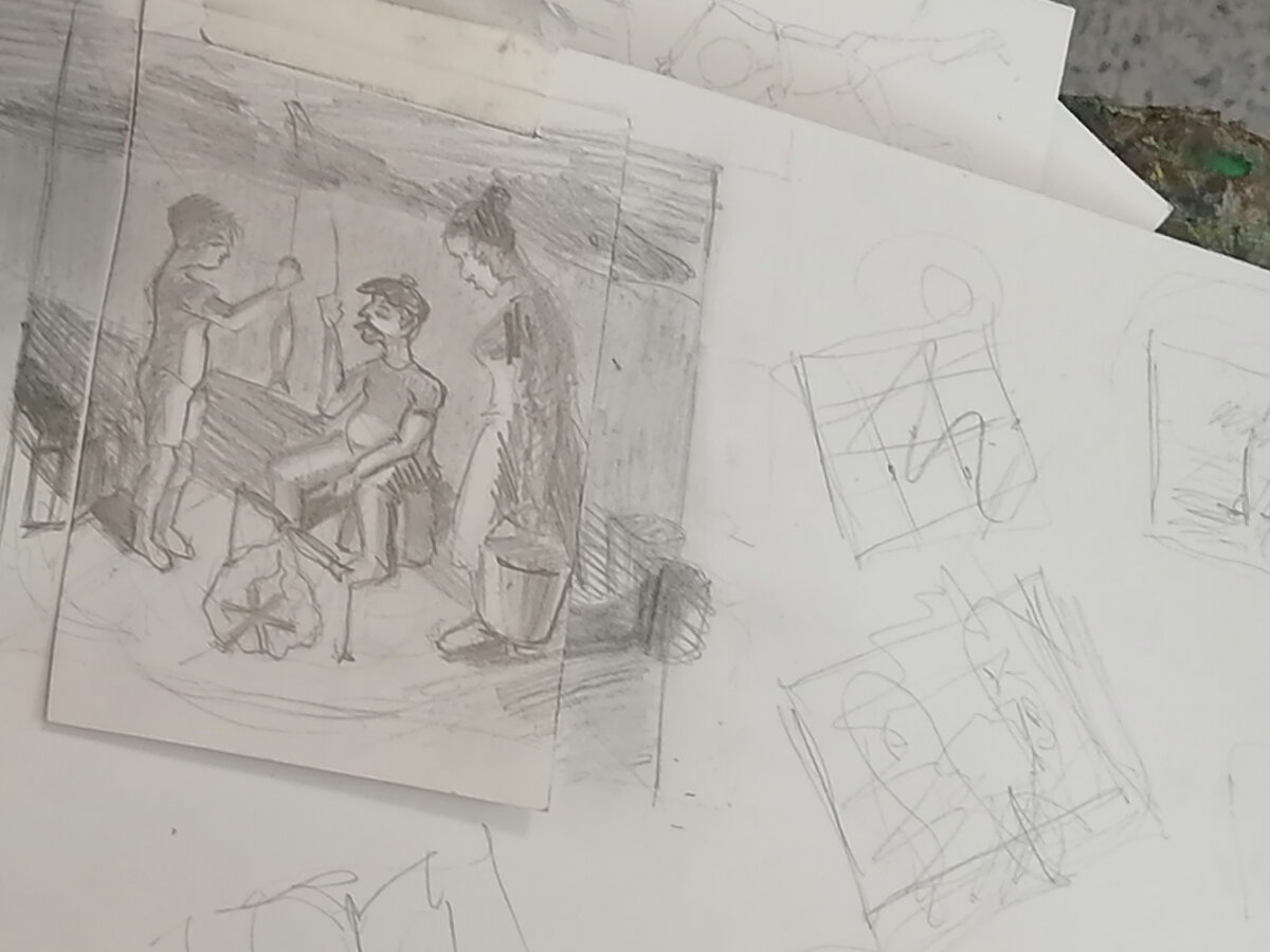 Работа на подготовительных курсах над композицией выявила сложности, с которыми сталкиваются начинающие художники. Тема звучала так: "Сюжетная композиция с людьми". Основные задачи: использовать не менее трех человек, которые должны быть завязаны одним действием, решить пластическое пятно, которое раскроет сюжет, в изображении выявить плановость. Материал и средства необходимо подобрать самим . Нельзя использовать маркеры, соединять акварель с гелиевой ручкой. Первое, что меня ввело в недоумение, что темы выбирались из насмотренных фото в интернете. То есть человек сам этого не видел, сам этого не наблюдал. Из-за этого неказистость в изображении, так как новичку сложно соединить разные фото, если ты не видел этого, то трудно понять, как действие происходит. Иногда только определенный ракурс может подсказать опрелеленный ход композиции. В форэскизе выбираем пластическое пятно в формате. В основном был момент четкого деления по вертикальной оси. Боязнь перекрыть одного действующего ли