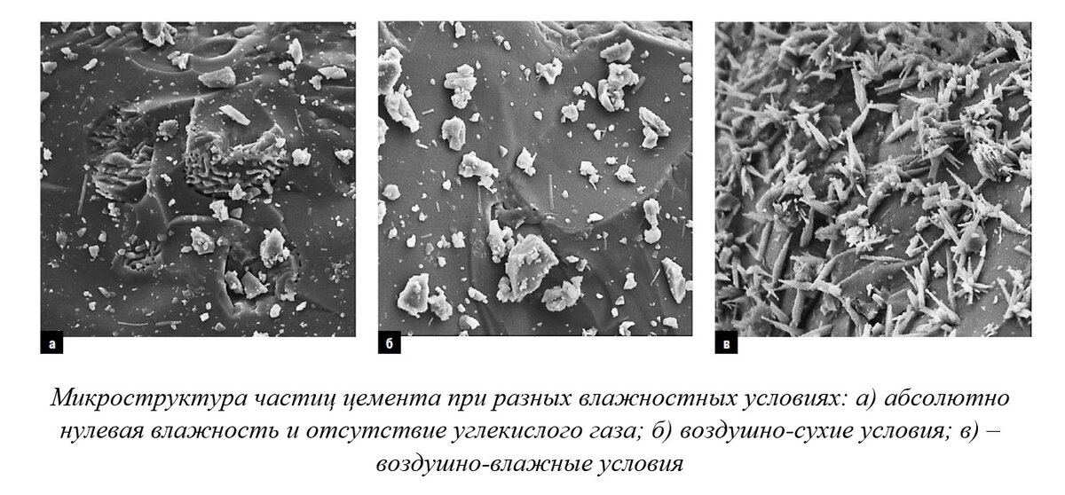 На качество цемента сказывается предгидратация частиц цемента, которая может наблюдаться на поверхности частиц, что также отражается на качестве цемента. Изменение микроструктуры частиц в разных влажностных условиях показано на рисунке. Для регулирования температуры материала в мельницу подается вода, которая испаряясь, понижает температуру корпуса мельницы и материала. В производственных условиях стараются не допускать температуру цемента, выходящего из мельницы выше 100-1100С с целью предотвращения полного обезвоживания двуводного сульфата и ложного схватывания цемента.