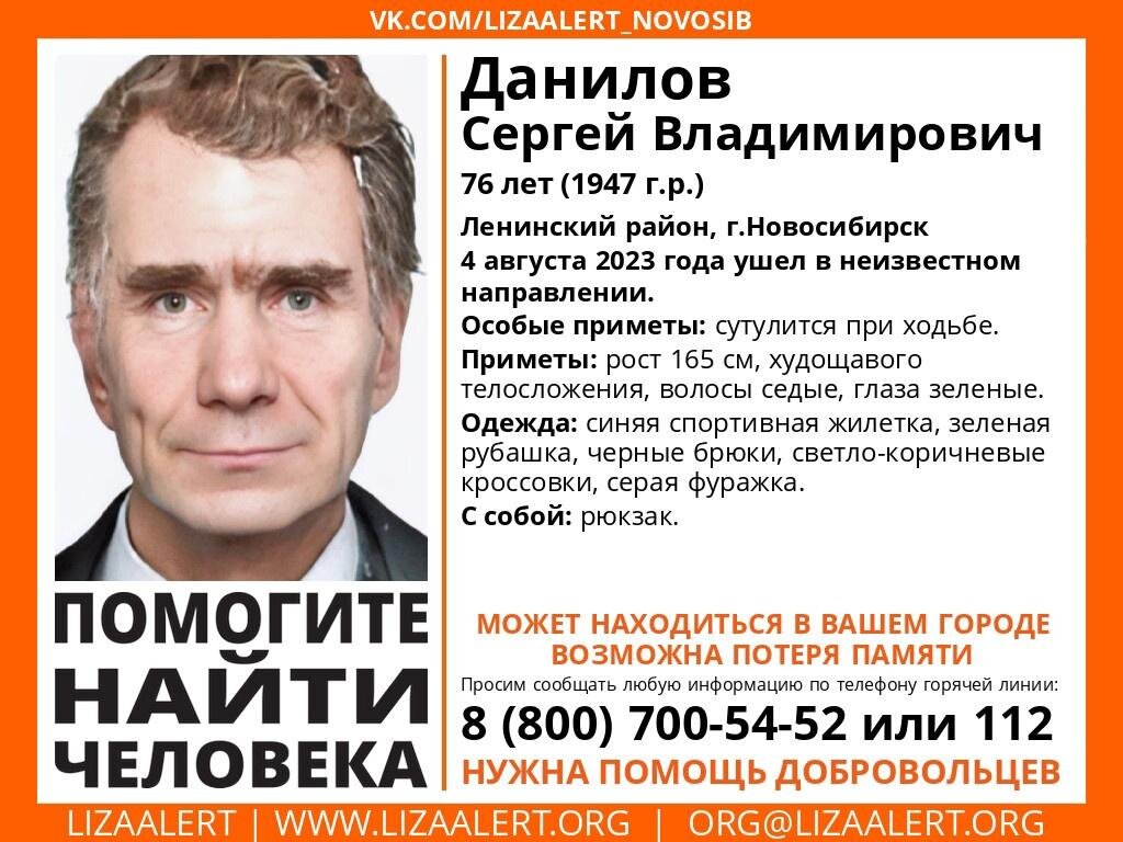 В Новосибирске ищут 76-летнего пенсионера, который ушел из дома. В Новосибирске пропал 76-летний Сергей Данилов. Мужчина ушел 4 августа из своего дома в Ленинском районе и не вернулся. Об этом сообщили в ПСО "ЛизаАлерт". Пожилой мужчина ростом 165 сантиметров, худощавое телосложение, при ходьбе ссутулится. У него седые волосы и зеленые глаза. На момент исчезновения Сергей был одет в синюю спортивную жилетку, зеленую рубашку, черные брюки, светло-коричневые кроссовки и серую фуражку. Он также носил с собой рюкзак. Помимо этого, у Сергея возможна потеря памяти. Если вы что-то знаете о его местонахождении или видели его где-то на улице, ообщите об этом волонтерам по номеру телефона 8-800-700-54-52 или в полицию по единому номеру 112. Как ранее писал Сиб.фм, в Новосибирске пропала 12-летняя девочка с розовыми волосами.